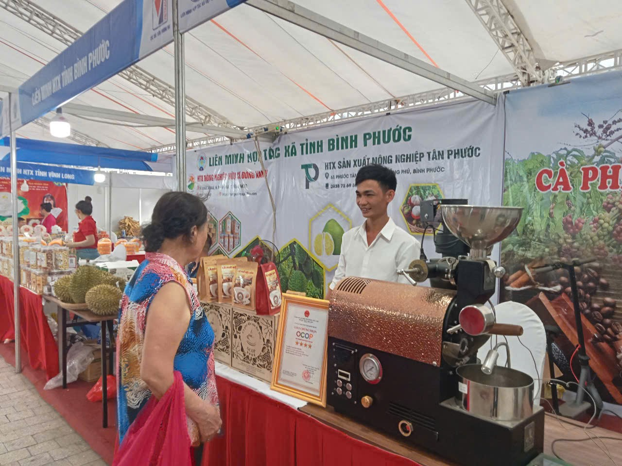 Dịp này, các hợp tác xã tỉnh Bình Phước cũng mang đến Hội chợ các sản phẩm như điều rang muối đạt ocop 3 sao của Hợp tác xã Nông nghiệp hữu cơ Đồng Xanh, sầu riêng đạt ocop 3 sao của Hợp tác xã sản xuất Nông nghiệp Tân Phước và cà phê nguyên chất đạt ocop 4 sao của Hợp tác xã Cà phê nguyên chất Bù Đốp.